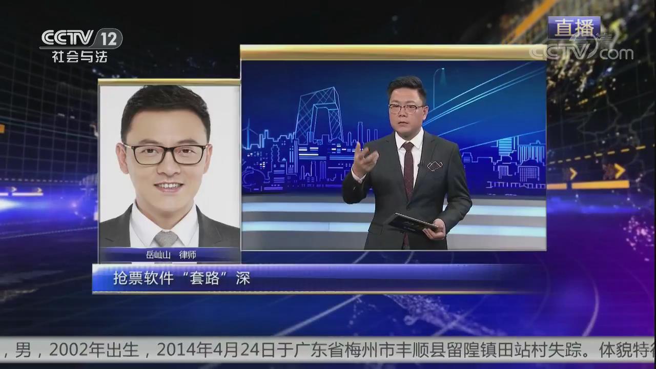 2018年1月15日,中央电视台《热线12》报道:抢票软件套路深,并在直播中就相关问题电话采访北京市岳成律师事务所高级合伙人岳屾山律师。