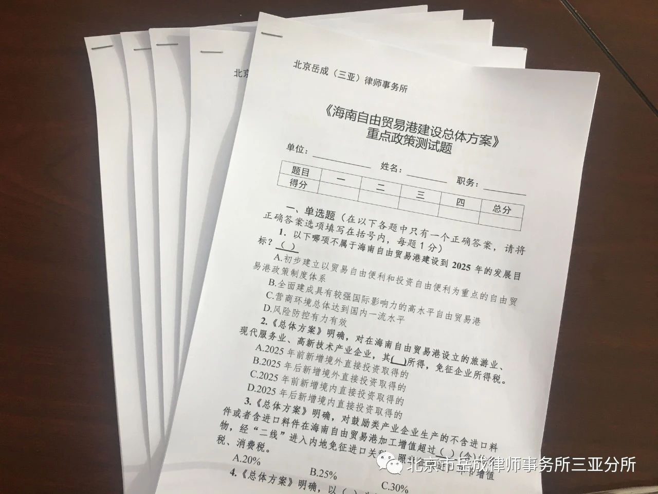 根据海南省司法厅办公室《关于开展<海南自由贸易港建设总体方案>重点政策测试的通知》要求,海南省律师协会组织全省执业律师在2020年7月31日前完成对《海南自由贸易港建设总体方案》重点政策测试的组织、组卷、判卷工作,由各律师事务所自行安排时间组织考试、自设考场,有力、有序做好此次测试工作。